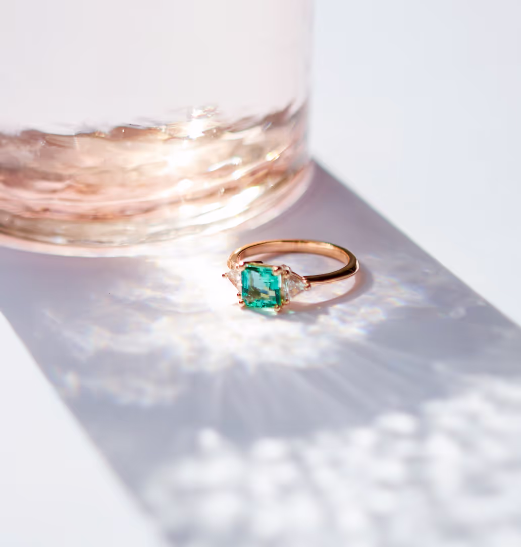 Voici une bague avec une émeraude particulièrement singulière. Nous avons cherché la teinte bleutée et la très belle clarté des émeraudes de Zambie. Cette superbe pierre est accompagnée de deux diamants taille triangle, donnant à l'ensemble un aspect unique et élégant.